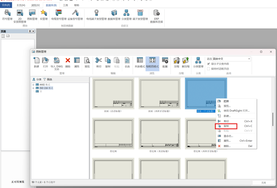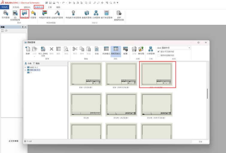 打开SOLIDWORKS Electrical软件 在数据库-图框管理 里面找到需要修改的图框模板。先复制出来一份,之后进行修改如下。