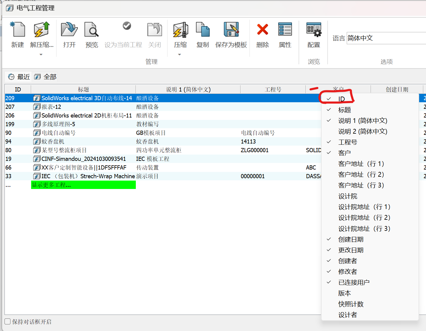 在SOLIDWORKS电气工程管理界面鼠标右键,勾选上“ID”选项,查看ID号。