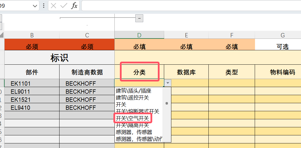 三、分类列,直接下拉选择,根据当前行物料的实际情况选择,此下拉选择与SWE软件设备型号库中一致(仅与导出时SWE中设备型号库中分类情况一致)。