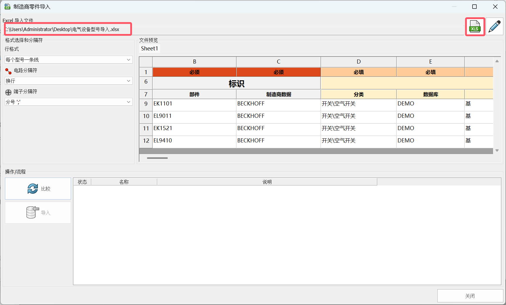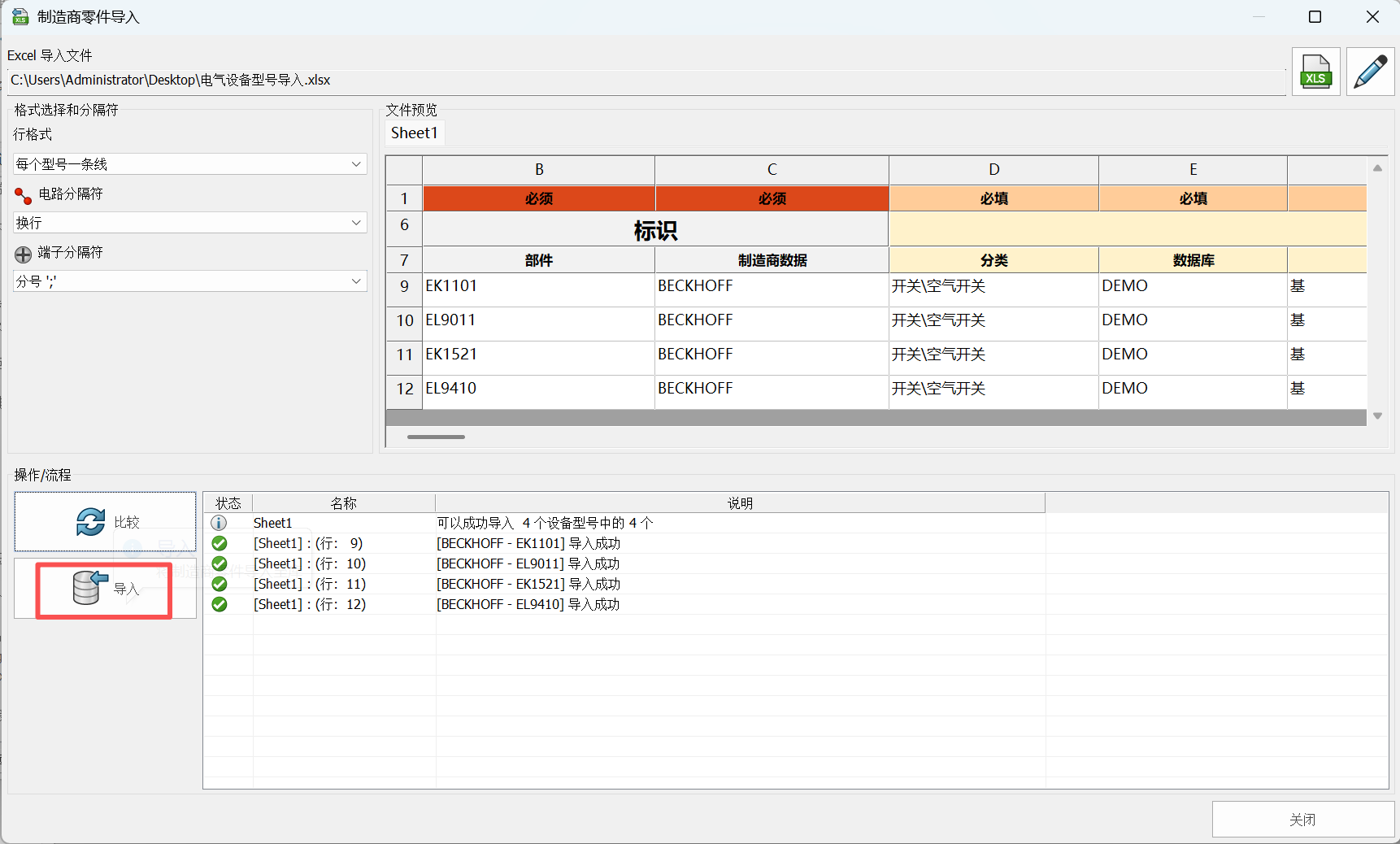 使用SOLIDWORKS Electrical(以下简称SWE)时,需要不断地完善其电气设备型号库,可以通过手动创建、官方设备型号库下载以及线下表格导入的方式积累专属的设备型号库。本章节介绍如何使用excel表格将数据批量导入至SWEl的设备型号库中。