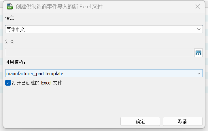 3、在弹出的对话框中选择需要的语言,是否勾选“打开已创建的excel文件”根据个人需求勾选,点击确定。