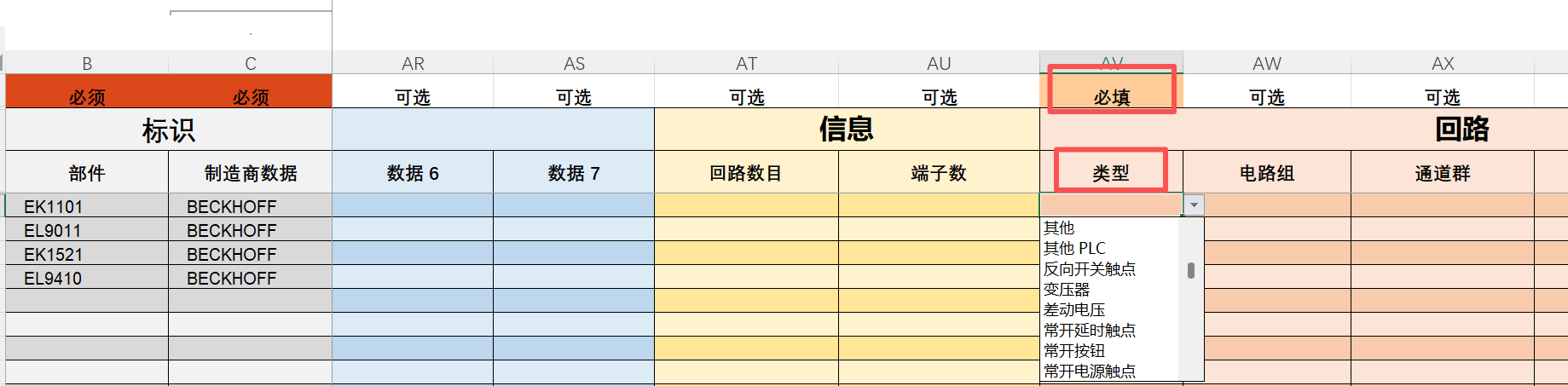 七、其他可选列可以根据需求定义,将表格往后拉,有个必填列,该列定义电气设备回路的类型。购买solidworks