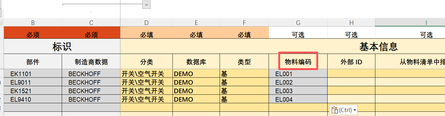 六、物料编码列,如果需要将物料编码一起写入,则定义好物料编码信息。