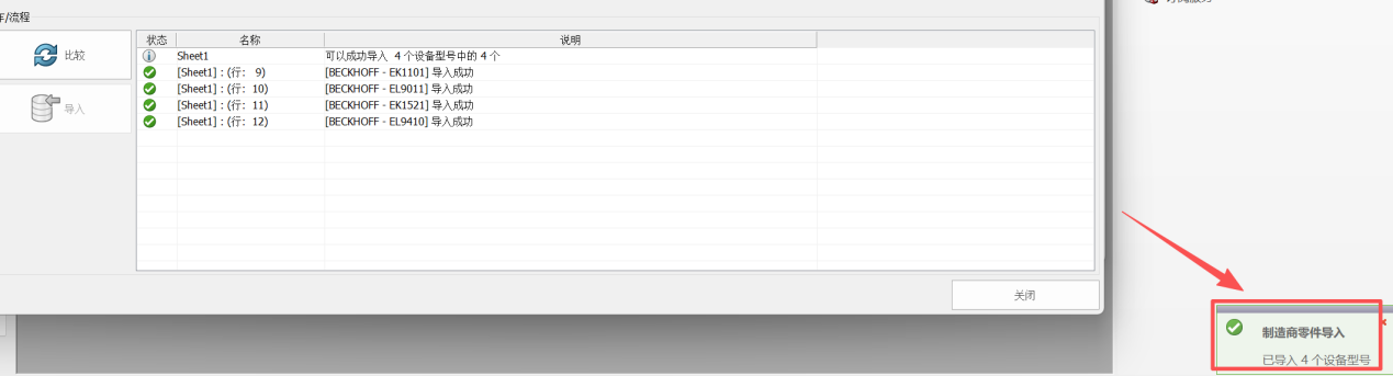 11、比较完成后,点击“导入”按钮,将状态为绿色勾图标的物料导入至SWE设备型号库中。solidworks官网