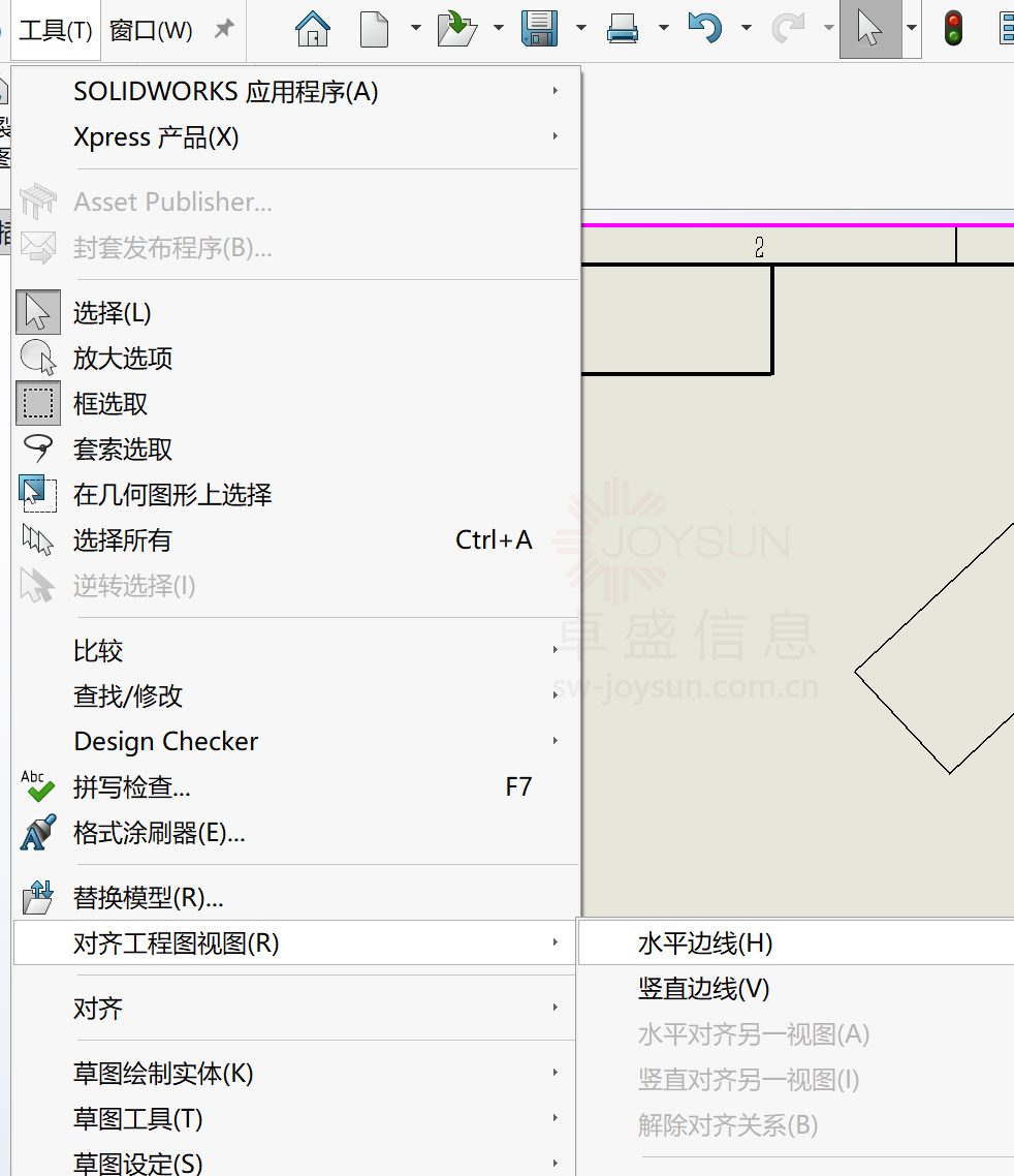 我们可以在工程图中选中我们要水平或者竖直的线。然后在工具-对齐工程图视图中选中我们想要的对齐方式。solidworks价格